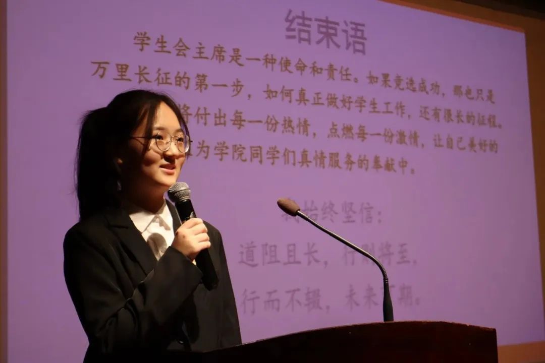 向全体学生骨干致以诚挚的感谢。伟大的时代呼唤青春的理想,伟大的事业激励青春的步伐,她期望新一届团学骨干能够勤思敏行,严于律己,起到表率作用、助手作用和凝聚作用,踏踏实实为同学服务,不断提升自己的综合素质。