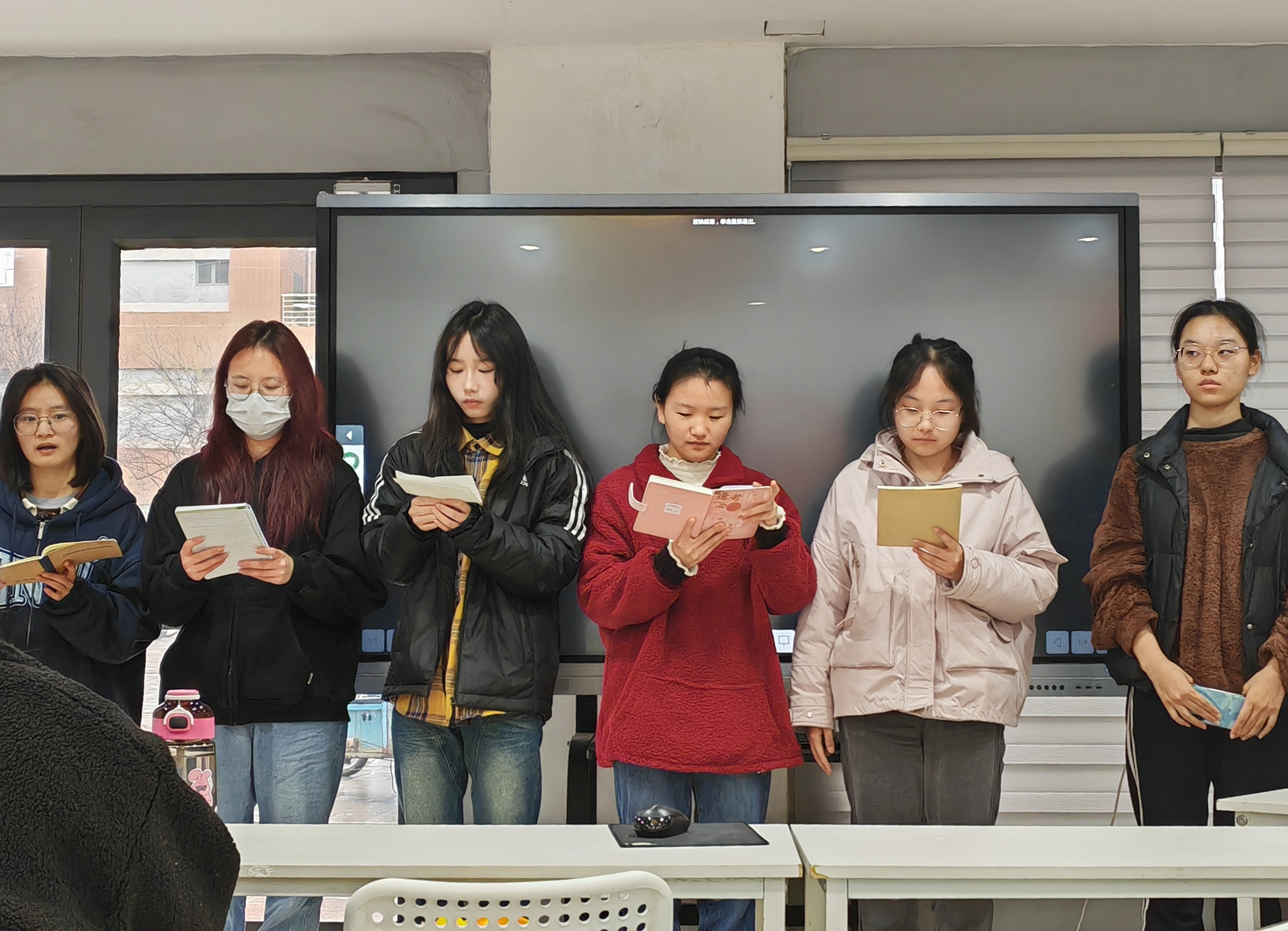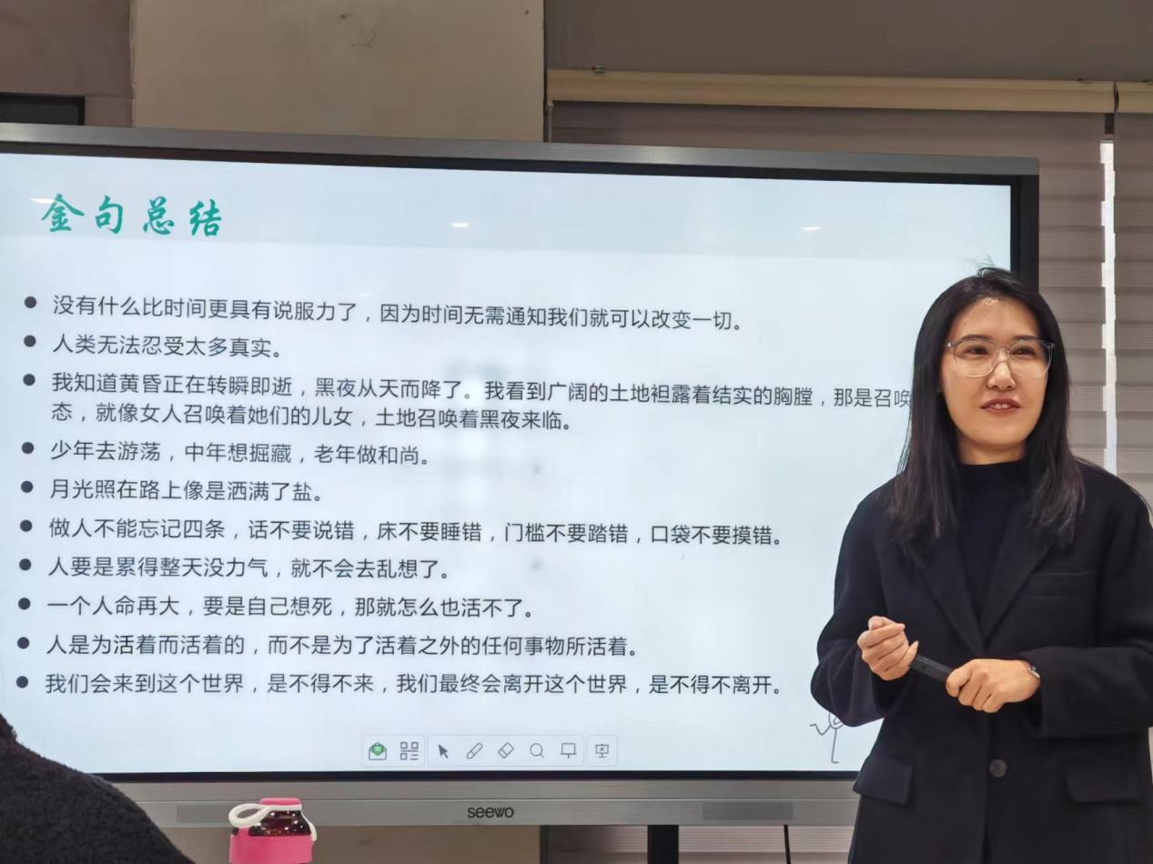 本次活动阅读书目为《活着》。学生们分五组展示读书成果,每组分享结束后,由郑一萌老师进行点评。第一组学生统筹全书,对《活着》进行了情节梳理、细节分析、主旨解读、金句总结以及感悟分享。学生积极思考、踊跃发言,老师巧妙辨难、循循善诱,师生之间开展了一场精彩的现实与真实之辩。第二组学生演绎了自创人物对话,语辞生动、意旨深远,表演极其贴合原作,赢得了学生们的阵阵掌声和老师的高度赞扬;第三组学生进行了分角色朗诵,从第一视角声情并茂地为大家讲述了福贵、家珍等各主要人物的生平;第四组学生分享了读书心得,以朴质的言语传递了各自真实的思想体悟,饱含文学敏锐和人文关怀;第五组学生为大家带来了读书笔记分享,内容精炼、见解独到,不仅有着眼于细节的深入分析,更有统揽全书的整体思考。