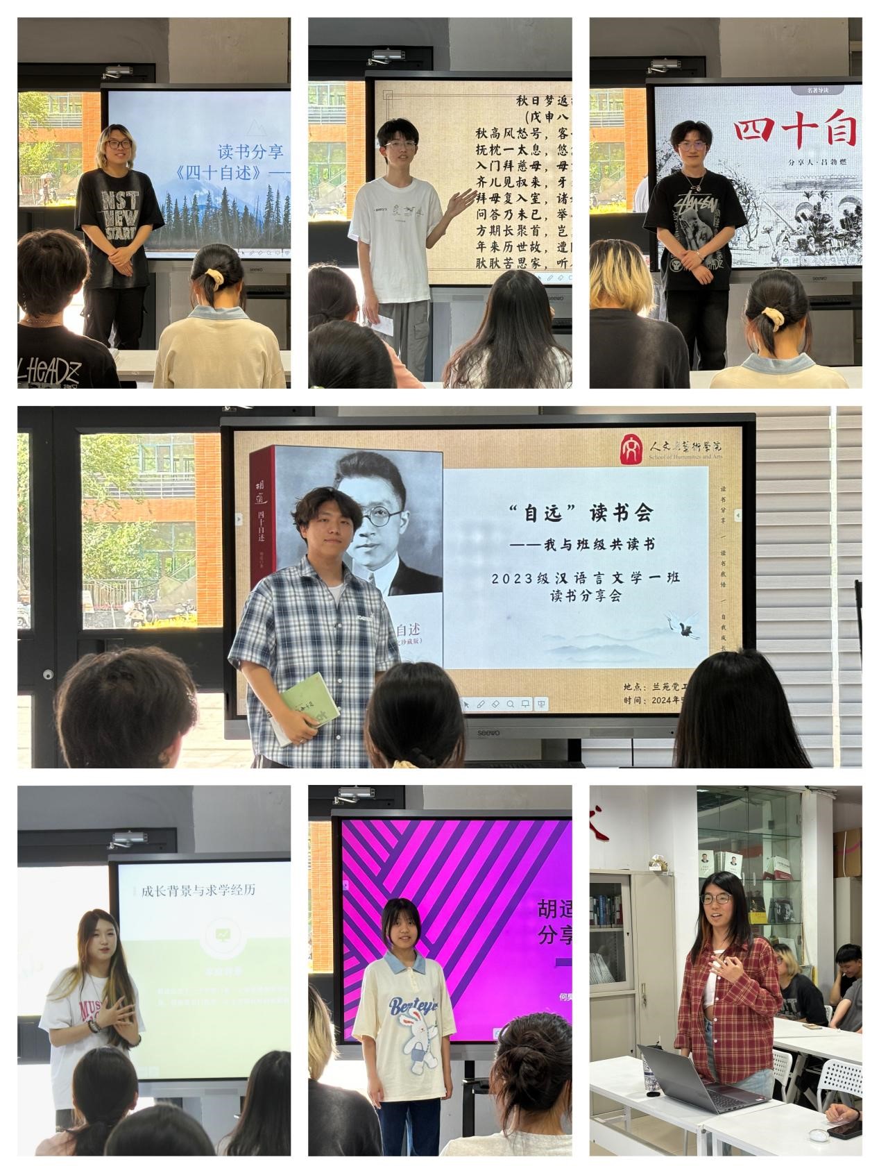 本期读书会的阅读书目是胡适的《四十自述》,主持人首先梳理了本书的创作背景和主要内容。随后,四名同学分享各自不同的阅读经历与感悟。李文珺将胡适自述视作“过去的我”与“现在的我”的一场通透的对话,对于她提出有关“四十不惑”的一些疑惑,冯仰操老师给予解答,“只要你一直在读书,你就一定不是一个固执的人。因为你永远在和最优秀的思想对话。”何昊结合专业知识提出了自己对胡适文学革命思想的思考见解;吕勃燃详细介绍了胡适的成长经历,分析了严父慈母对胡适成长与发展的影响;苑广浩将本书与《从文自传》进行了谱系对比,从而得出了中国文人对于自传创作普遍存在自觉、严谨、坦诚态度的观点。分享结束后,主持人带领大家重温原文,使大家认识到自传文体“给史家做材料,给文学开生路”的存在价值。葛瑶瑶、薛龙鑫两位同学与大家分享了胡适创作的诗歌《秋柳》《秋日梦返故居》,深度剖析了胡适的成长经历及个人思想。