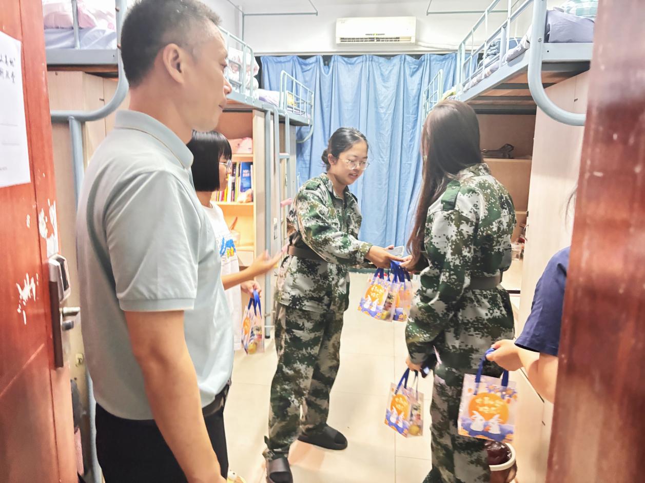 慰问过程中,汉语言文学24-1班班主任史修永、专职辅导员刘青、兼职辅导员王子栋为新生送上月饼和水果,详细询问了新生在军训中的感悟,了解新生的学习和生活情况。史修永鼓励大家要尽快适应大学生活,努力学习专业知识,积极参与各项活动,全面提升综合素质。刘青肯定了同学们的刻苦训练,希望大家继续保持训练的热情和毅力,发扬军训精神,为人文必发