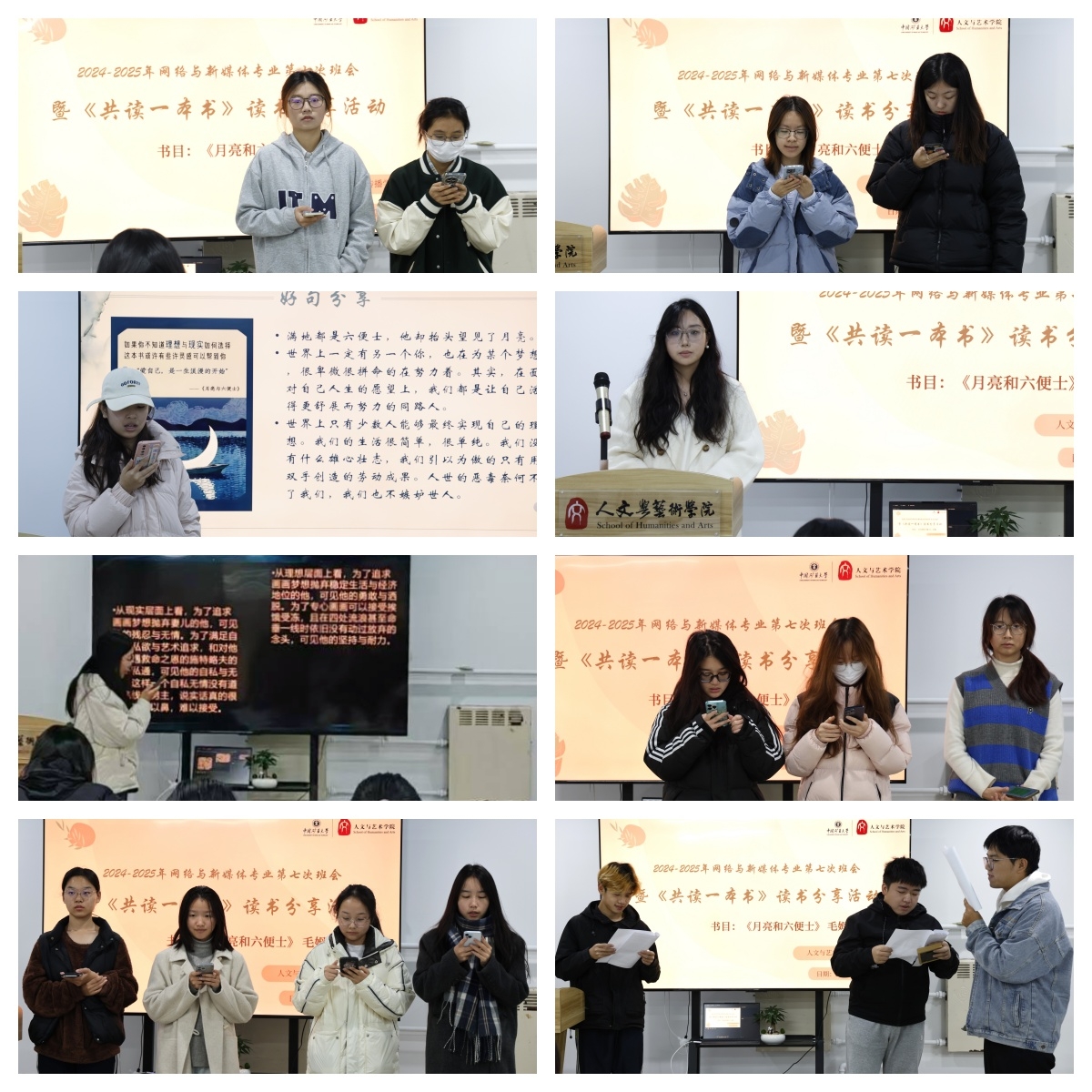 本次读书会分享阅读书目是《月亮与六便士》,同学们分别以阅读感想讨论、PPT展示、文章片段解读、人物对话演绎等多种方式展开分享。前三组成员以主人公斯特里克兰德的故事为切入点,分享自己对于理想与现实的看法;第四、第五组成员则以PPT的展示,探讨了书中表达的理想与现实之间的矛盾挣扎,引发大家对于如何平衡内心追求与现实责任的深入思考;第六组的同学以书中的片段来分享自己的阅读感悟,他们借助斯特里克兰德对于梦想的解释,鼓励同学们要在理想与现实之间找到平衡点,在承担社会责任的同时勇敢去追寻属于自己的那个月亮;第七组的同学为大家带来了一场新颖而精彩的人物对话演绎,成员们惟妙惟肖的表演,表现出斯特里克兰德对现实的漠视与对绘画的极度追求,赢得现场热烈的掌声。读书会最后,李惠荣同学做出总结,她指出《月亮与六便士》不仅仅是一部经典的文学作品,它也是一面镜子,映射出每个人内心深处对于梦想与现实的抉择。