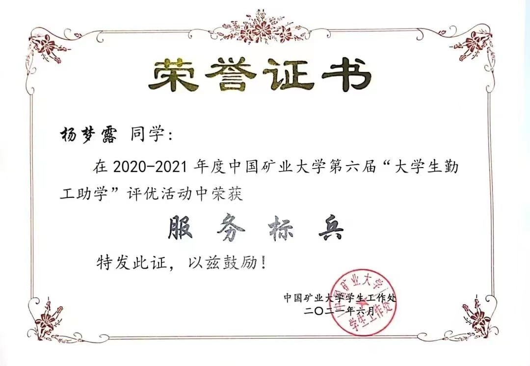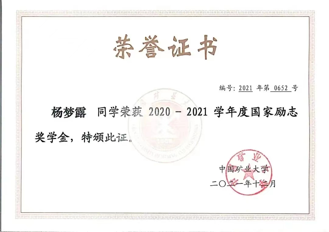 刚步入大学时,杨梦露就为自己定下了目标。她深知自律是拉开差距的最大原因,因此从入学之际便不曾有过松懈,矢志不渝朝目标奋斗。成绩是汗水最好的回报,在大学期间杨梦露曾联续两年取得中国矿业大学校级二等奖学金、院级优秀学生,一次国家励志奖学金。