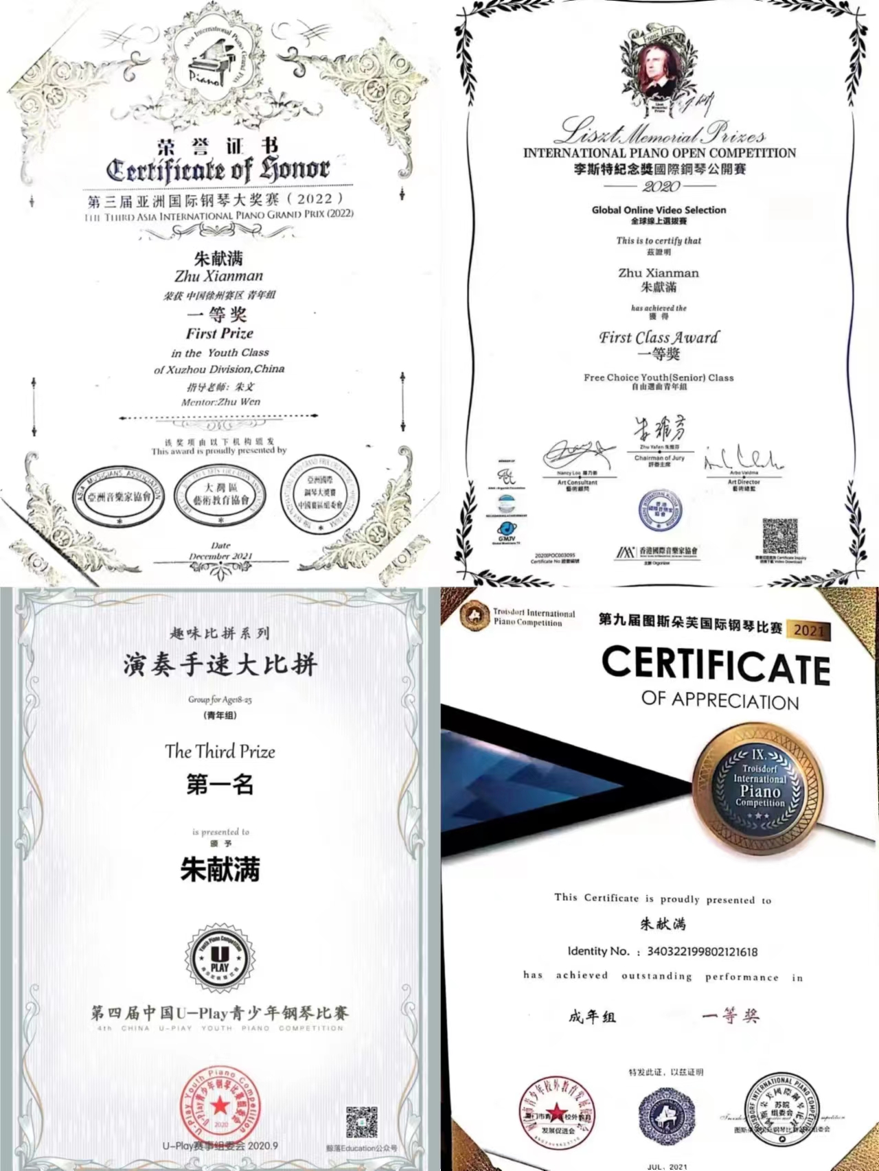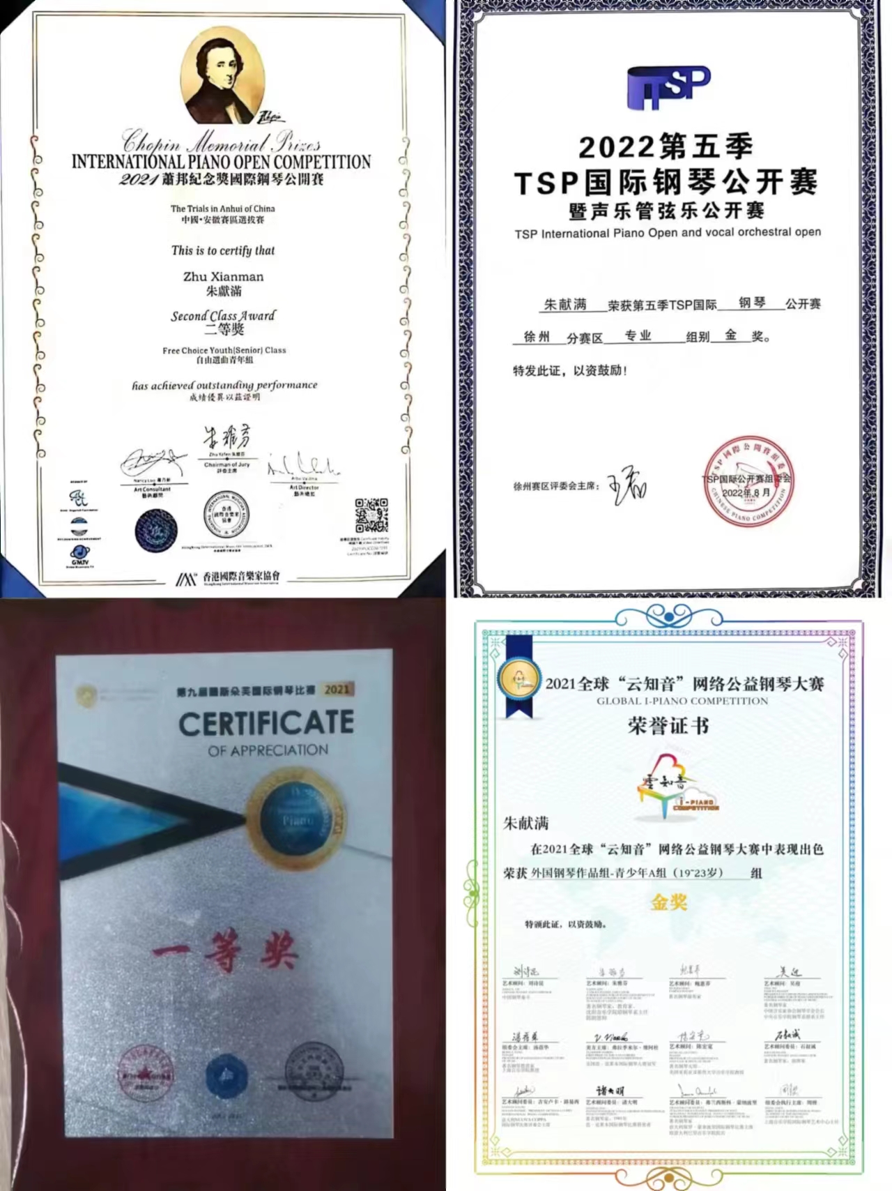 功不唐捐,玉汝于成。朱献满连续三年获得校级优秀学生称号,共计获得了一次国家奖学金和两次校级奖学金。此外,大学三年他还在安徽省级钢琴比赛中获得十余次一等奖、在江苏省级和徐州市级钢琴比赛六次并获得优异成绩。