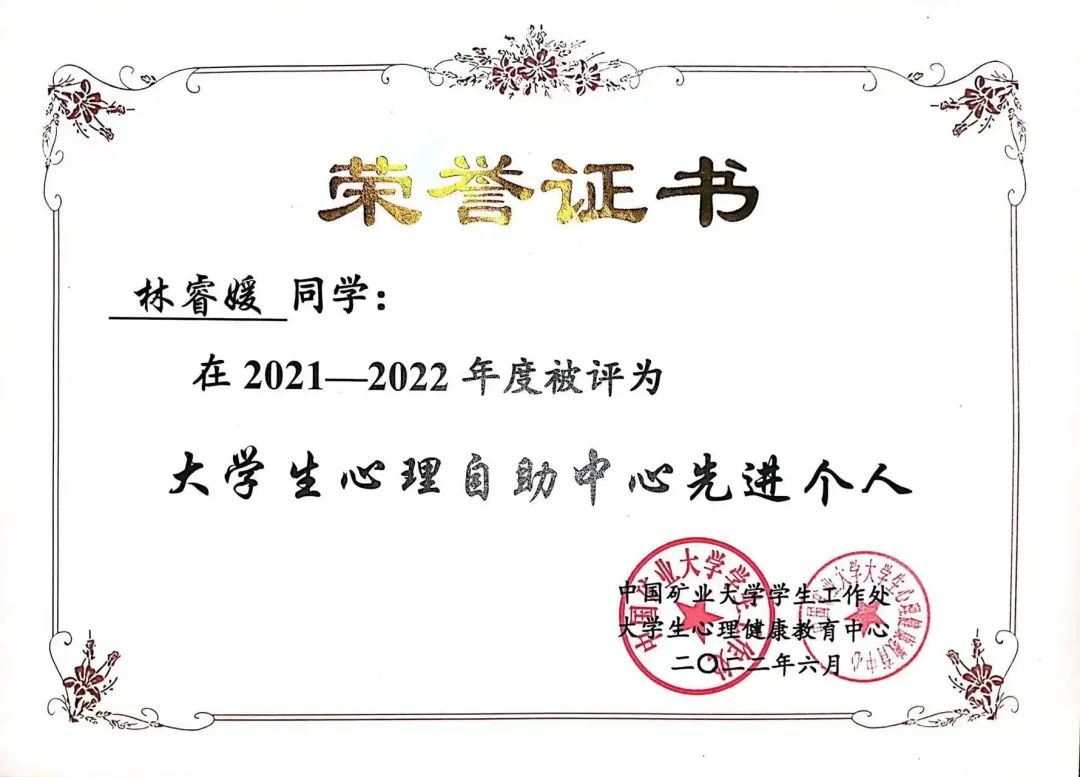 简历上,曾担任院大学生心理自助中心主席的履历格外耀眼。谈及在心自助工作,林睿媛和记者聊起她在大三下学期拍摄心理情景剧《归巢》的经历。剧本《归巢》排剧时恰逢考试周,临近期中,考试时间各个专业不统一,当时她白天抓紧时间复习,晚上排练。就算人不齐,林睿媛与成员们也坚持每晚七点在党工委排练,每天询问大家哪个时间点方便一点,优先最多同学有空的时间段。拍摄期间,由于人手不足,林睿媛身兼多职,承担了选拔剧本、演员、剧务、摄像的工作。当时离截止日期只有五天,时间紧张,事务庞杂,林睿媛出于作为心自助主席的责任心并且考虑到情景剧是大家的集体荣誉,又揽下了剪辑任务。在大家的共同努力下,《归巢》取得很大成功,获得了中国矿业大学第十四届校园心理情景剧比赛一等奖。