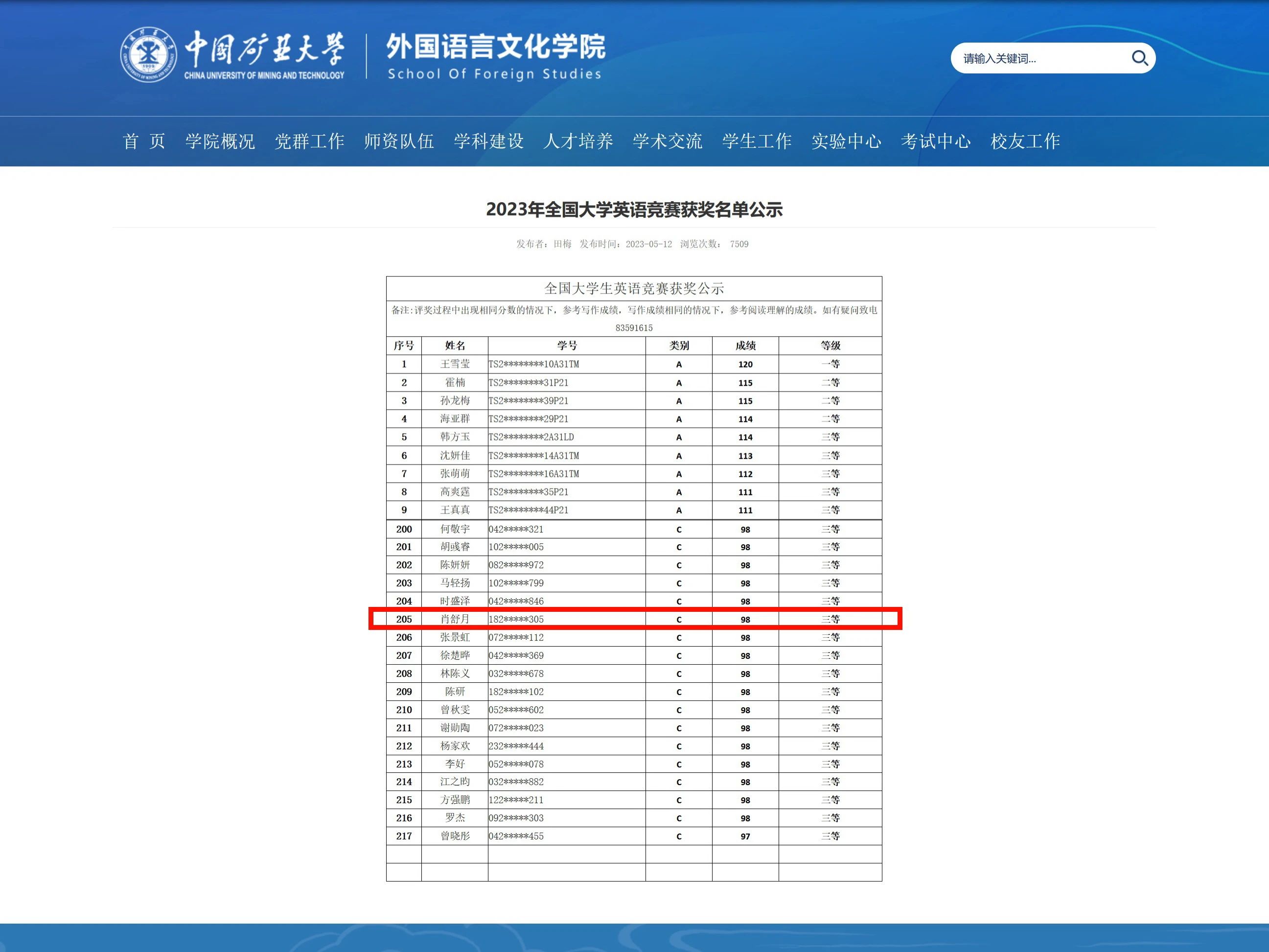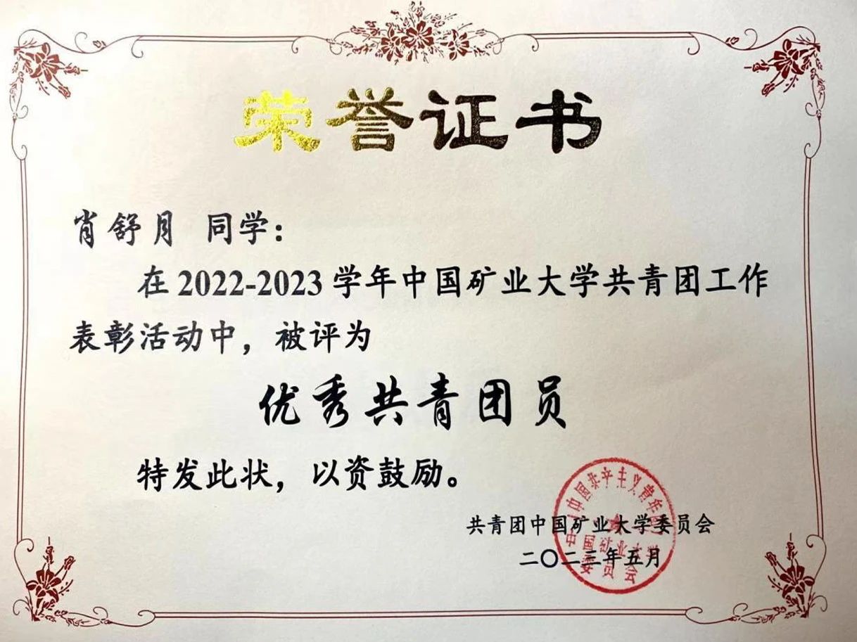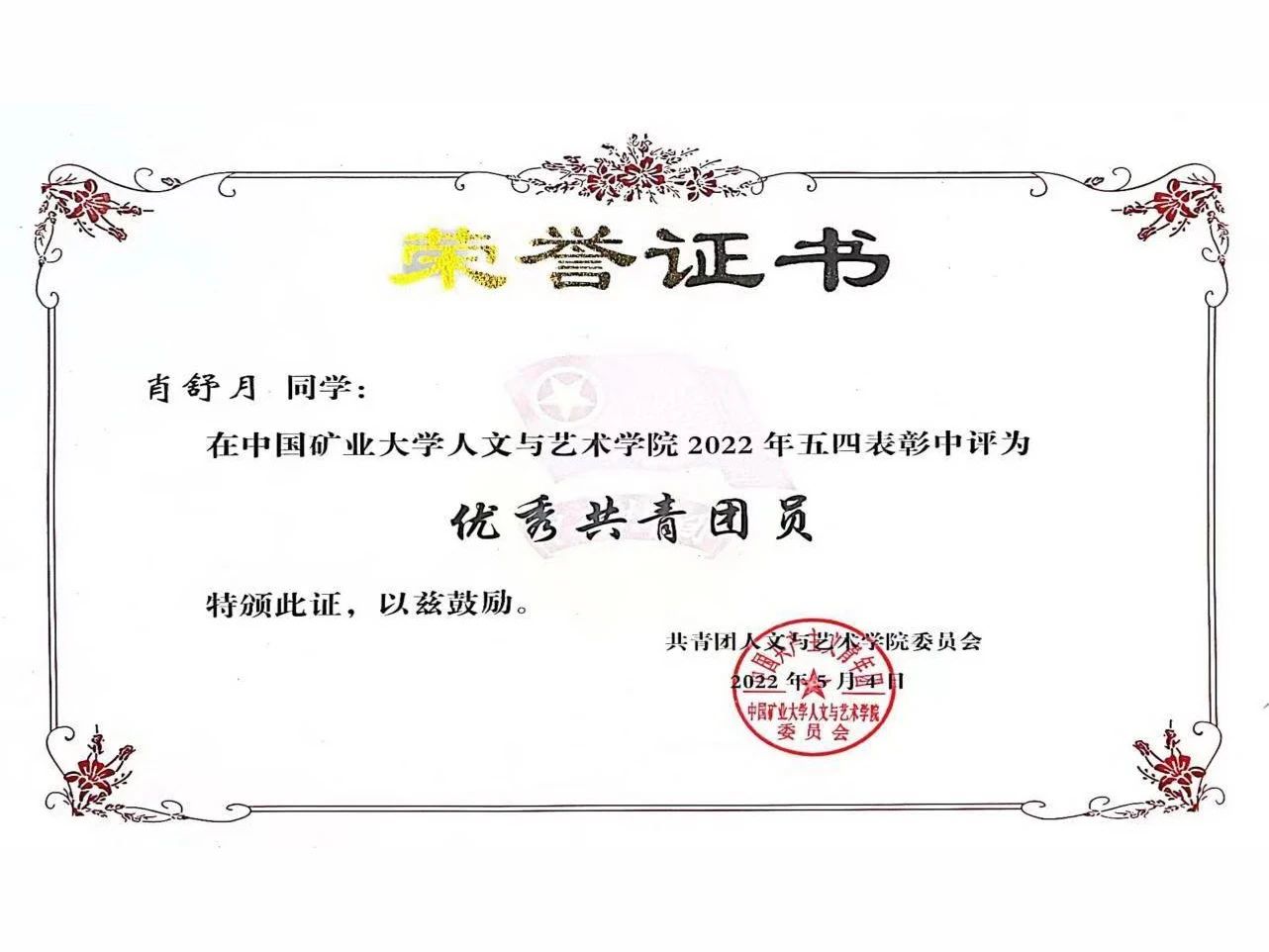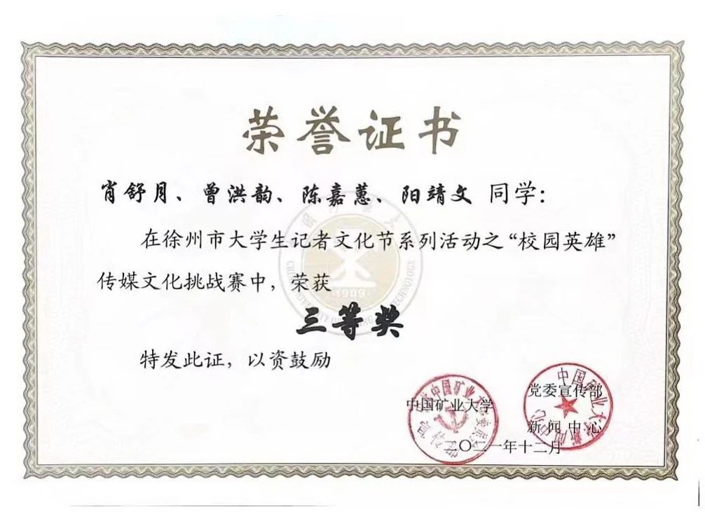 广播电视学2020级本科生,保研至暨南大学新闻传播学。曾获2023年全国大学生英语竞赛C类三等奖、“批改网杯”全国大学生英语写作大赛优秀作品奖、徐州市“花开徐州 春满彭城”短视频作品大赛一等奖、徐州市大学生记者文化节系列活动之“校园英雄”传媒挑战赛三等奖、广播剧社年度话剧公演活动“大戏之夜”二等奖、“学宪法 讲宪法”短视频大赛三等奖、“安全让生活更美好”短视频大赛三等奖,获中国矿业大学一等奖学金一次、中国矿业大学三等奖学金一次,获中国矿业大学“优秀共青团员”等荣誉。