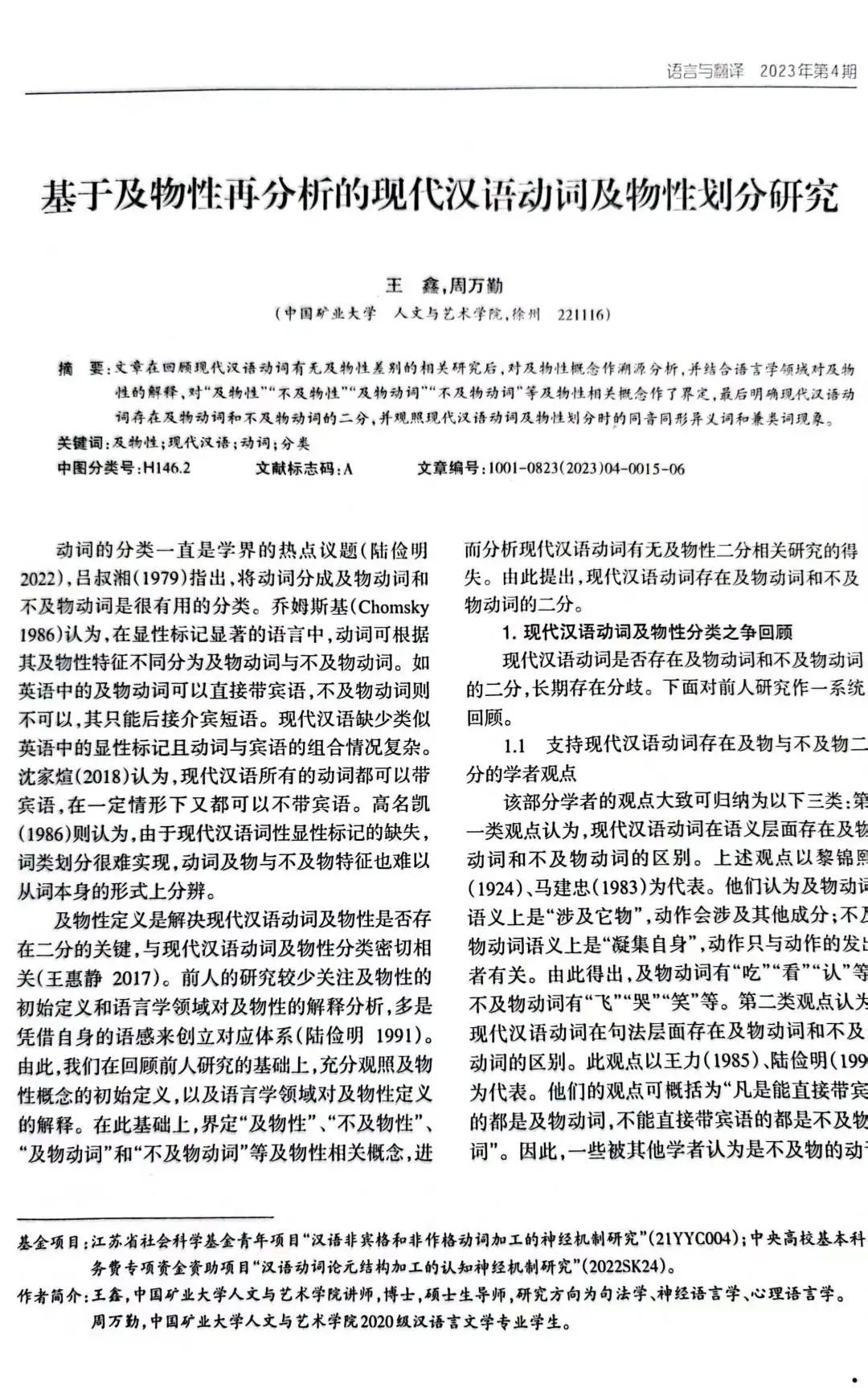 在王鑫老师的指导和帮助下,周万勤打开了科研的大门。语言学作为一门基础学科,不仅与计算机、医学、神经科学、认知科学等多个领域紧密相连,更是为这些领域提供了重要的理论基础和实际应用。以ChatGPT为例,其语料处理和机器的深度学习正是语言学领域最基础、最核心的应用之一。论文的撰写是一个漫长的过程,需要日复一日沉下心来读书,反反复复打磨修改。为了学好语言学,周万勤不仅深入学习本专业的知识,还积极拓宽视野,培养包容性思维。他利用课余时间自学了编程、高等数学等跨学科知识,以实现知识的综合运用。