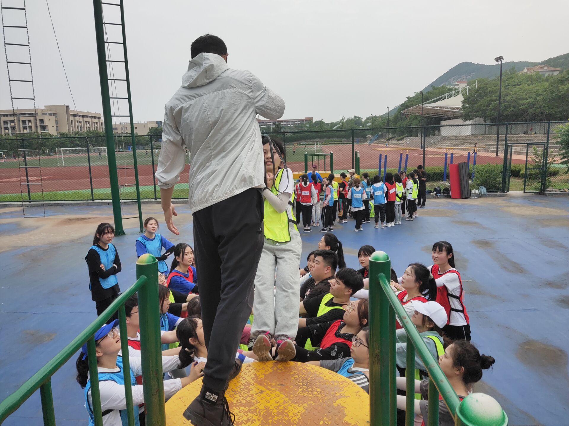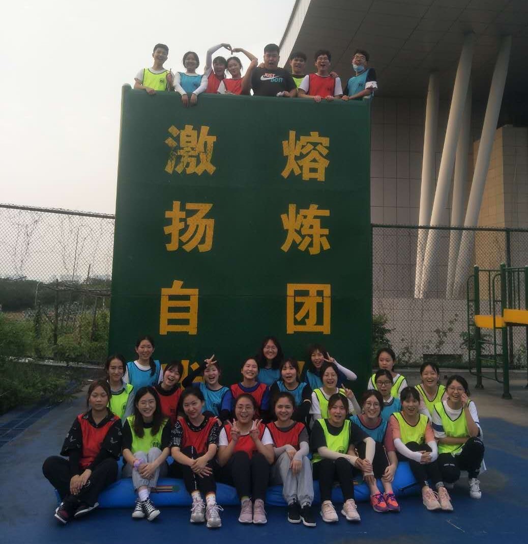 活动的第一环节为团队建设。班级同学分为三个队伍,集思广益,决定了团队的队名、队歌、队训以及队徽。在大家的共同努力下,每个队都想出了独一无二的队名和队训。在参与制作队徽的过程中,队员们增进了彼此的沟通和了解,也增强了班级凝聚力。活动的第二环节为信任背摔。同学们要轮流站在高台上背对着大家倒下来,其他同学将手臂搭在一起组成保护网接住背摔下来的同学。此项活动需要勇气,更考验了每个人对于整个团队的信任度。
