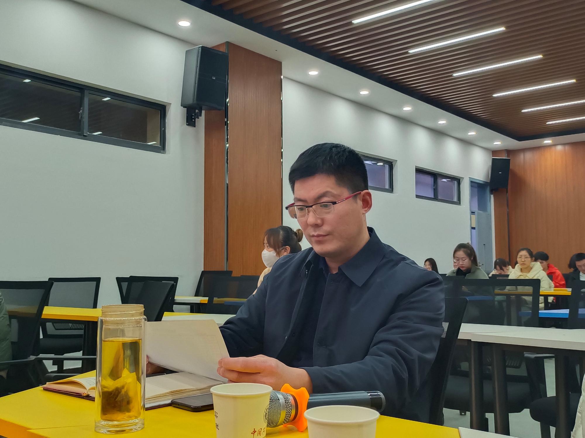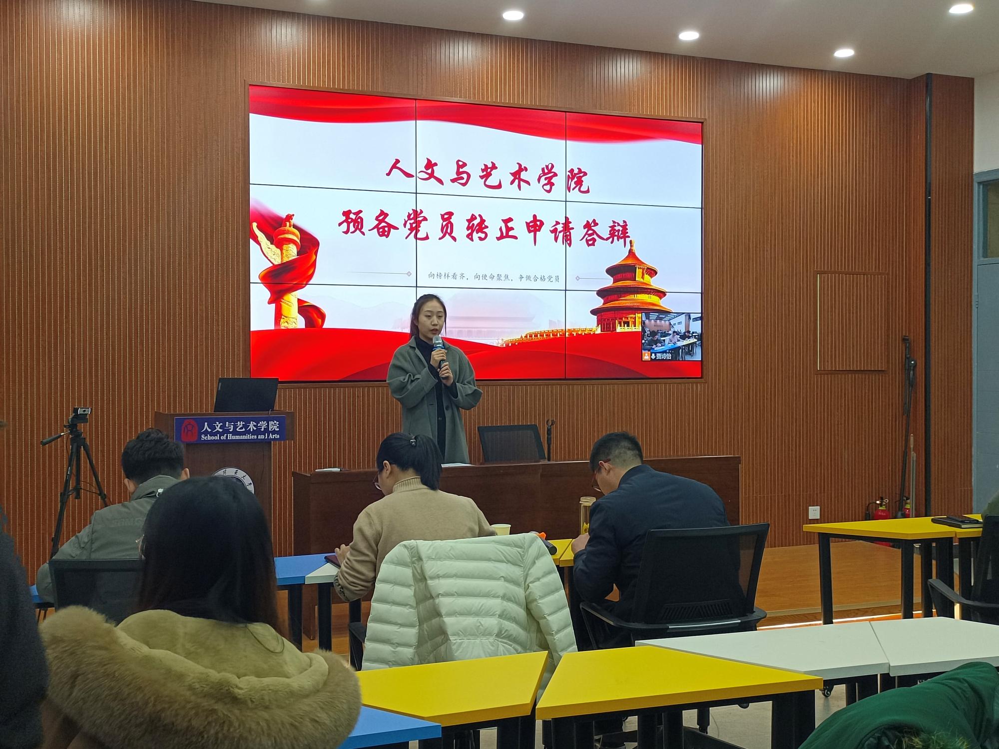 于文科楼A111开展转正申请答辩活动,党委副书记丁恒星,学工办主任李玉雪、苏辉,兼职辅导员杨安华、何军出席本次活动。活动采取线上线下相结合的方式,一位答辩秘书负责维持现场答辩活动的秩序。