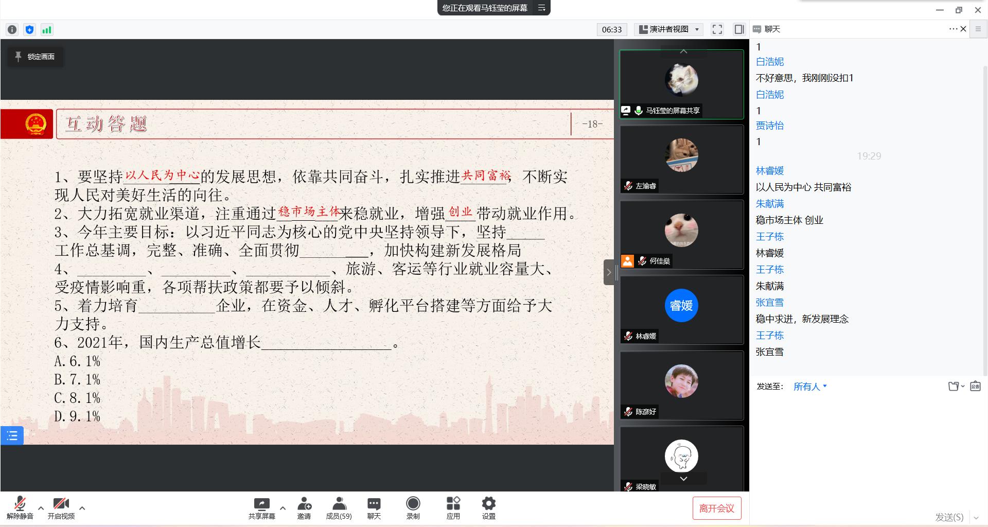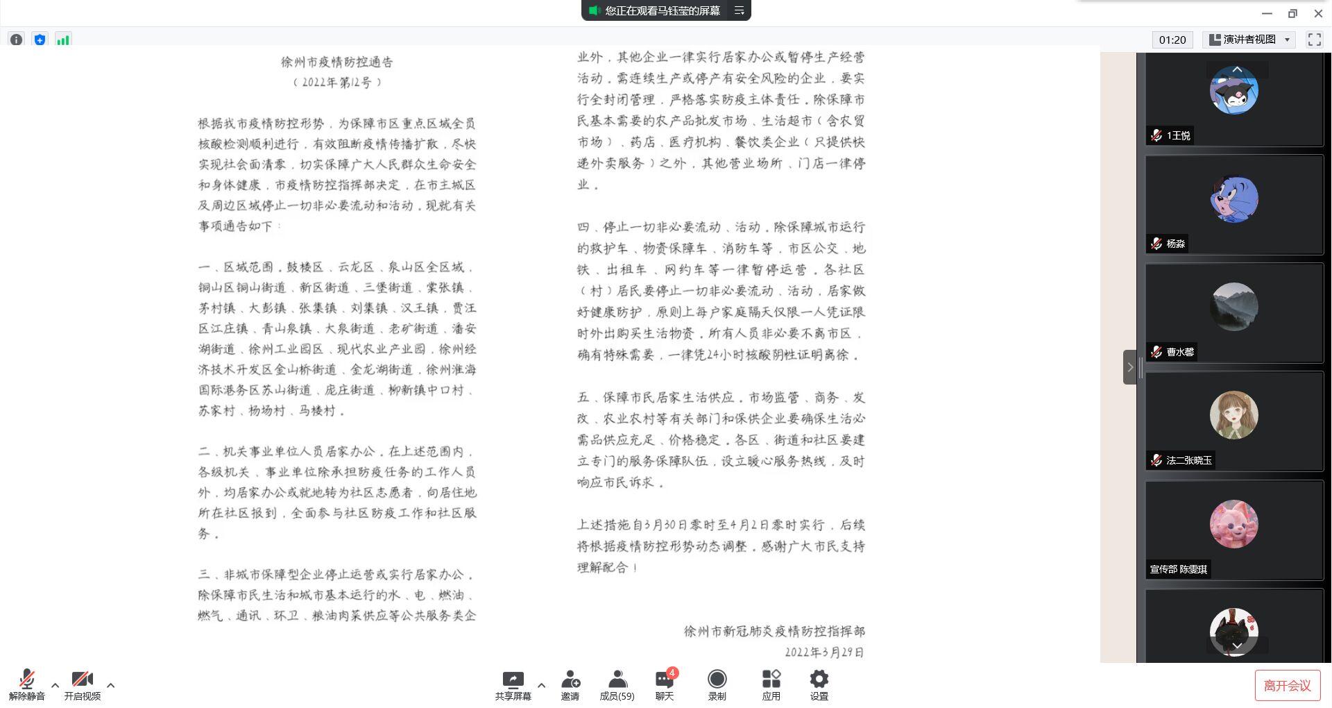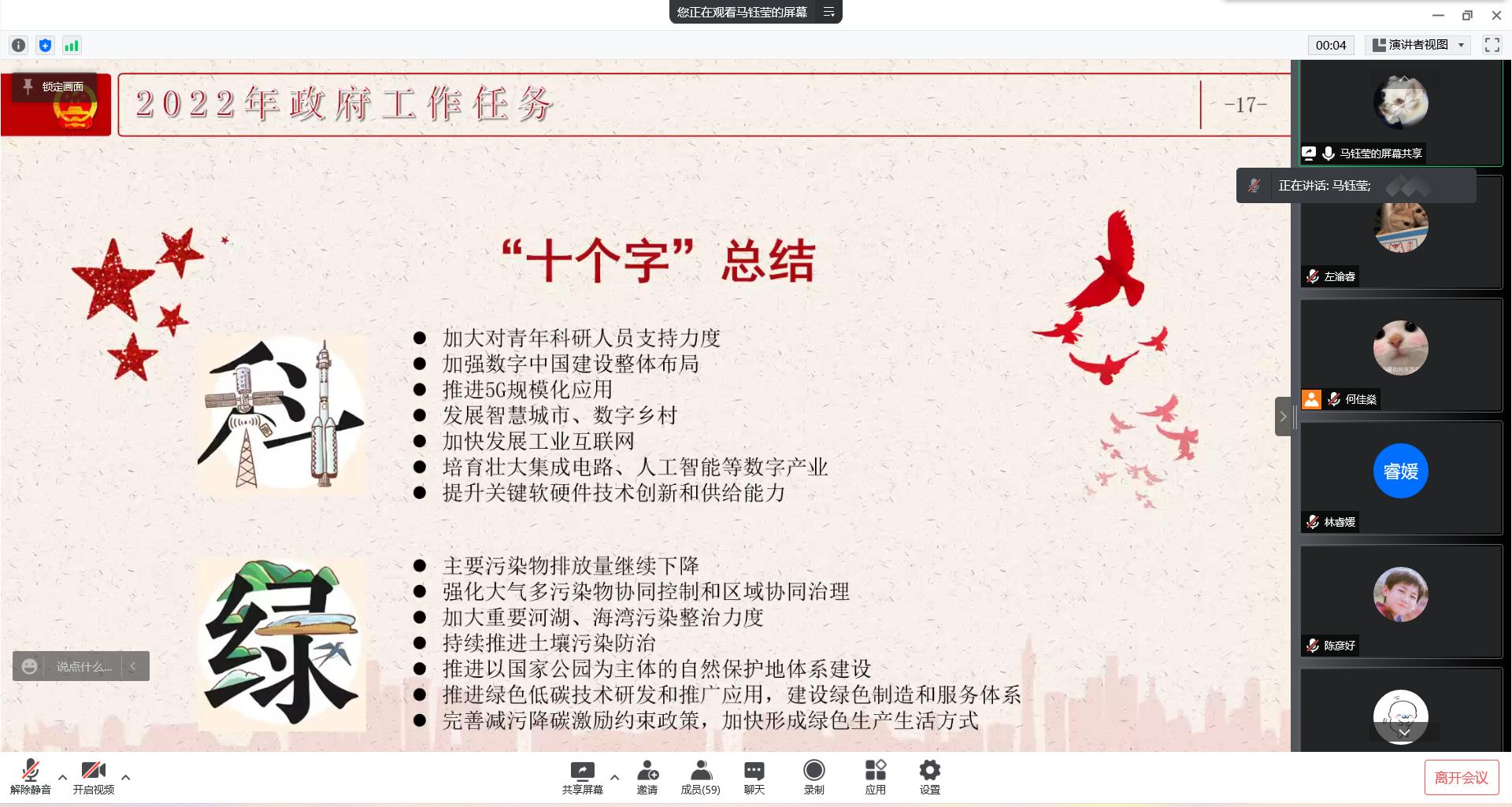 活动伊始,副站长刘振乾进行发言,分享本轮徐州疫情暴发以来的见闻及切身感悟,讲述紧邻疫情封控区的自家小区的当前防控举措,以及堂叔一家作为密切接触者的隔离生活状况,通过细节展现疫情防控工作者的艰辛付出,号召党站全体成员拥护党中央国务院的决策部署,支持动态清零总方针,并且在最后从严格遵守规定、甘于奉献担当、正确面对网络信息、合理疏导焦虑情绪四个方面提出要求。接下来组织部带领同学们对2021年政府工作及其取得的成就进行了回顾,解读了我国经济社会发展总体要求和政策取向,并以“十个字”总结了2022年政府工作任务,最后设置了有奖竞答环节,帮助同学们巩固今日的理论知识。