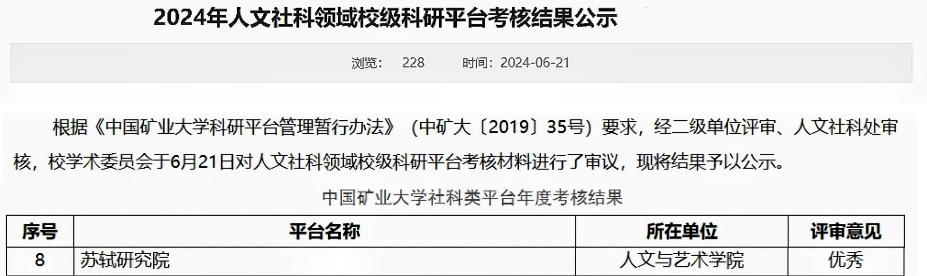 中国矿业大学苏轼研究院自成立以来,始终致力于以更广阔的视角对宋代大文豪苏轼进行全方位的文化研究,并重点对苏轼在徐州为政期间的文化遗存价值进行深入研究。此次考核的优秀成绩,不仅是对苏轼研究院过去努力的认可,更是对未来发展的激励。苏轼研究院将以此为契机,继续深化研究内涵,拓展学术视野,为苏轼文化的学术研究拓展新的疆域,同时为中国矿业大学校园文化建设和徐州市的城市文化建设做出积极贡献。