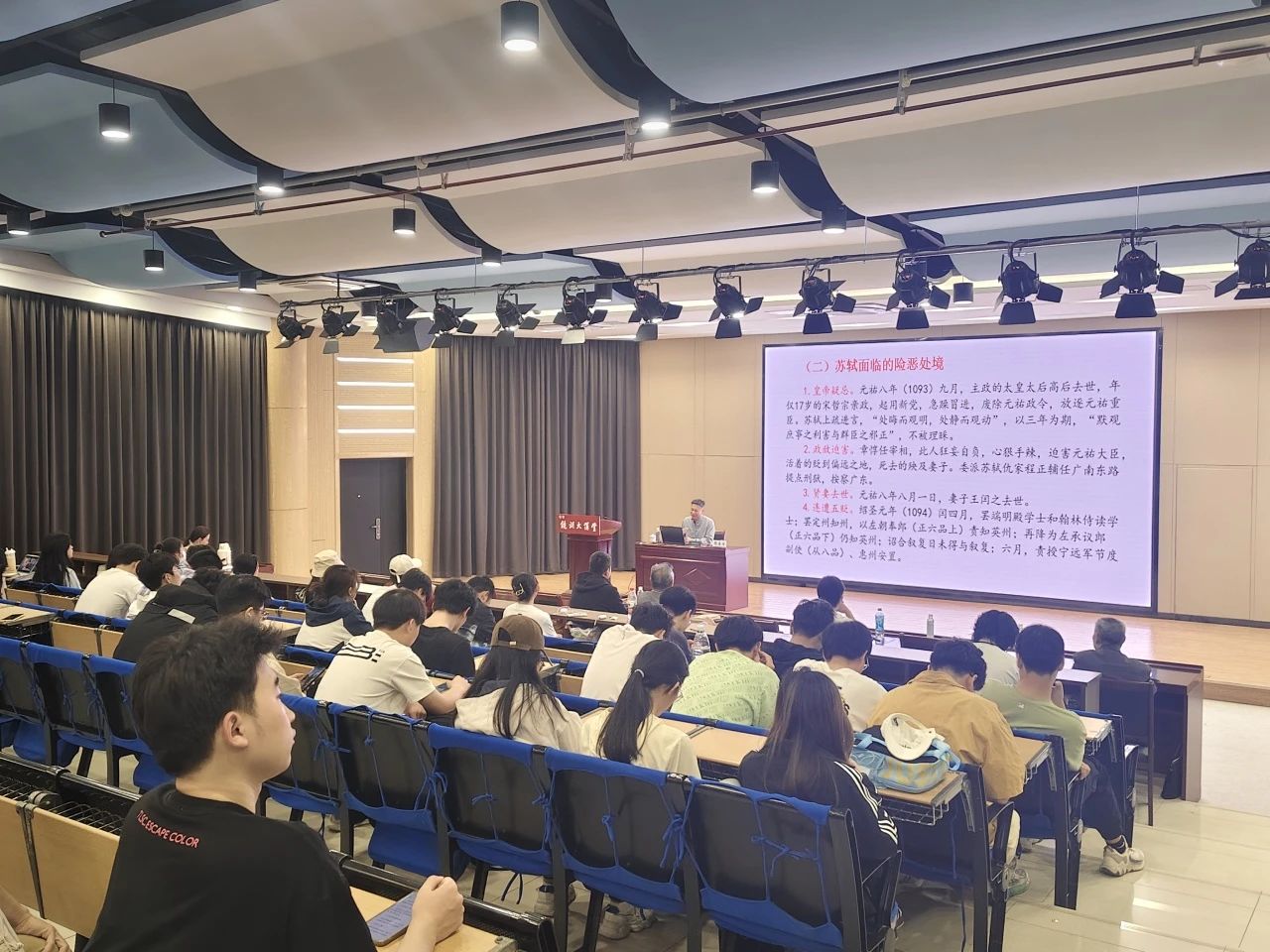 讲座点评环节,中国矿业大学苏轼研究院院长管仁福教授首先指出,周教授从《自题金山画像》一诗切入是准确的。不同于在徐州时期,苏轼在黄州、惠州、儋州时身处困境,无权签署公事,这是苏轼将此三州作为一生功业的一个重要原因。此外,管院长还指出,周教授提到的“文与道俱”非常重要。苏轼一生肩负着崇高的文化使命,即斯文有传、继往圣之绝学,他一生最看重的三部解经著作(《东坡易传》《论语说》《东坡书传》)是在被贬的地方完成的,这体现了宋代文人文化观念的转变,不同于唐代文人以建功立业为人生最大追求,他们更注重文化传承。接着,管院长强调,苏轼文化是精神文化、铸魂文化,开展苏东坡系列讲座不仅有助于宣传苏轼文化,还能使更多人通过讲座全面、深刻地了解苏轼,学习苏轼的豁达精神和文化传承精神。最后,管院长鼓励大家按照周教授列出的参考书去全面了解苏轼,并再次感谢周教授的精彩讲座。