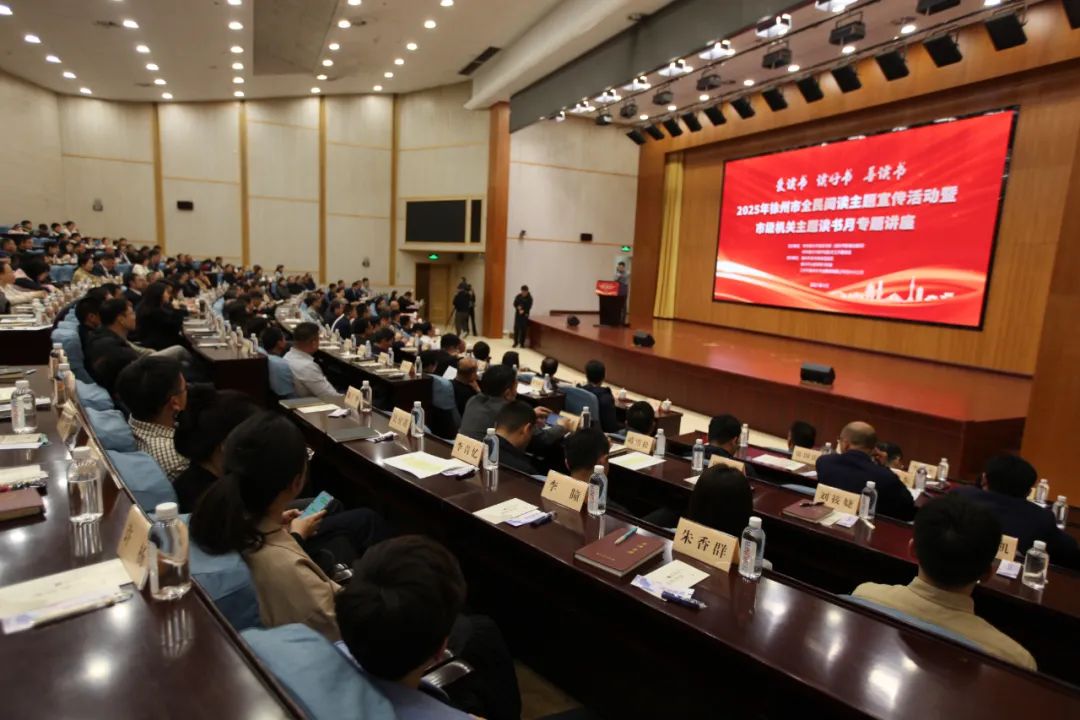 4月15日下午, 2025年徐州市全民阅读主题宣传活动暨市级机关主题读书月专题讲座在市行政中心会议中心小礼堂召开。本次活动由中共徐州市委宣传部(徐州市新闻出版局)、中共徐州市委市级机关工委主办,徐州市全民阅读促进会、徐州市出版物发行协会、江苏凤凰新华书店集团有限公司徐州分公司协办,徐州市级机关等单位约240人参会。中国矿业大学苏轼研究院院长、徐州市苏轼文化研究会副会长管仁福教授应邀参加了本次活动。